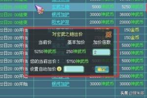 2如下图所示,表示拍卖中的物品即可以出价操作,点击“出价”,加载了我选中的玄武之铠出价框,可以看到当前价5250神武币,基本加价250神武币,加价倍数及输入框,我在加价倍数下面的输入框填写了2,所以我的当前出价=5250+250*2=5750神武币,记得点确定哟