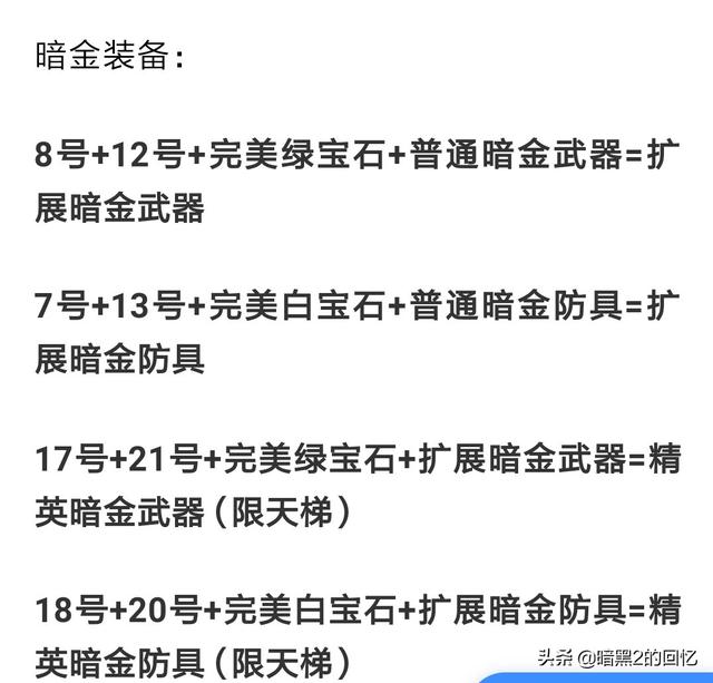 暗黑2战网天梯模式1.10版本后加入了装备升级公式,可以将普通的暗金防具或武器升级为扩展版,扩展版升级为精华版,装备原属性不变,极大提升物品的基础防御和伤害,无形的同样有效。