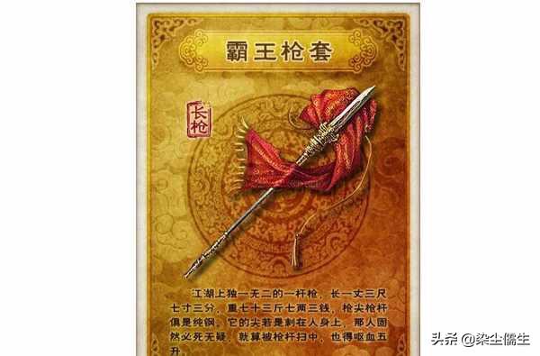 是黄金和精钢铸造的一种合金,看上去非常抢眼,据传抢长一丈三尺七寸,重八十一斤,枪头非常锋利,被点到者非死即伤。枪身超重,不幸被扫到者粉身碎骨。项羽在灭秦,战刘邦,战韩信的战争中一把霸王枪天下无敌。